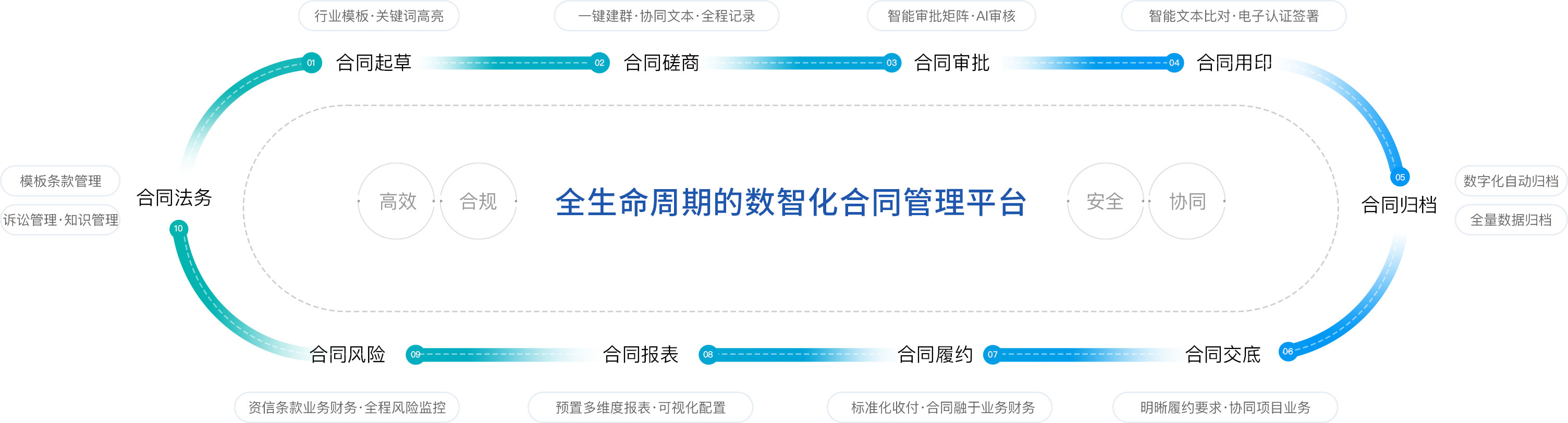 合同文本编辑器、模板条款协同,模板套用、限定编辑、关键词凸显、内容比对、协同磋商等等智能组件,提高文本处理能力