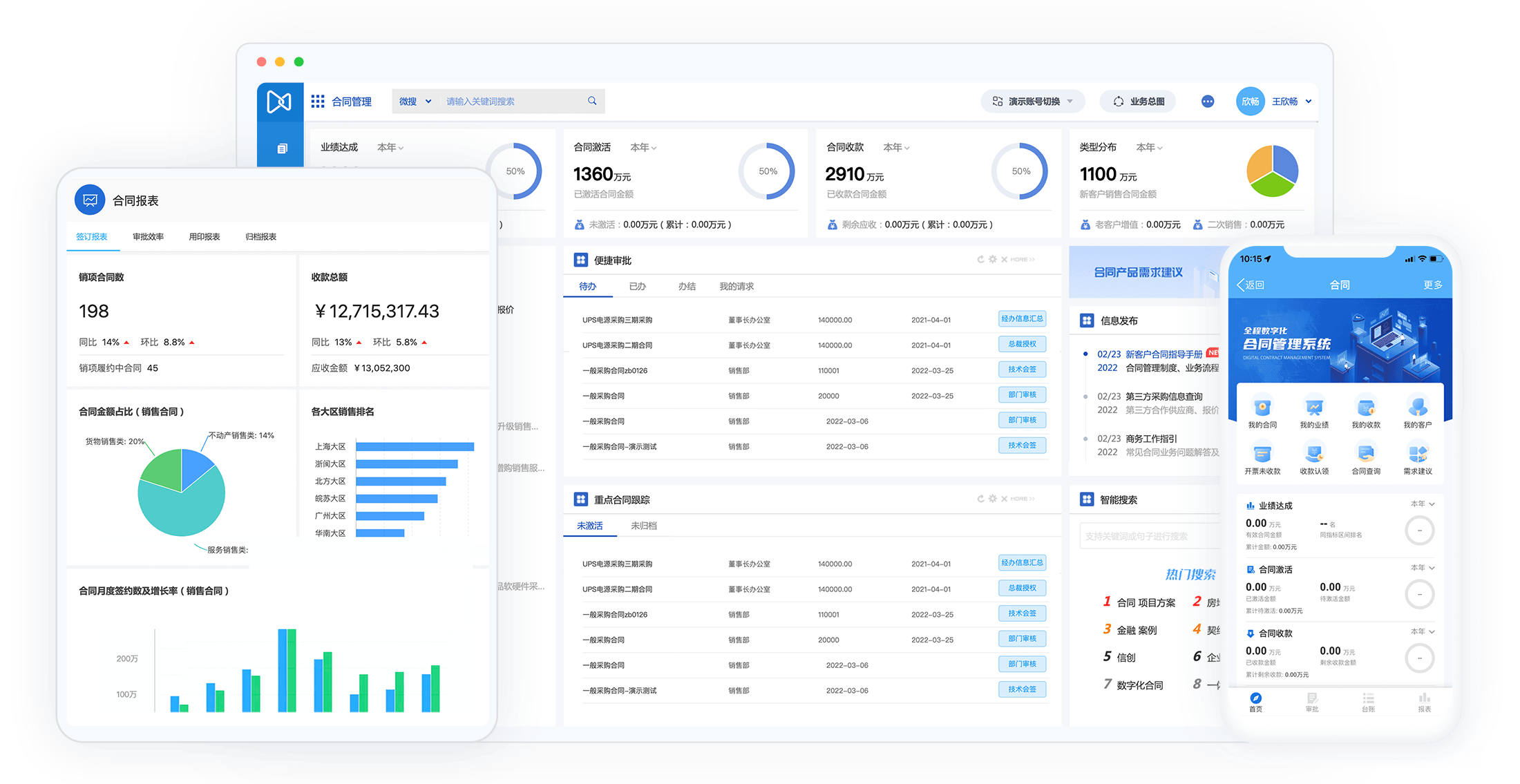 提供合同签订、执行、风险等统计报表;合同数据与业务、财务数据协同,与资金支付、业绩核定等相互关联,自定义更多分析报表