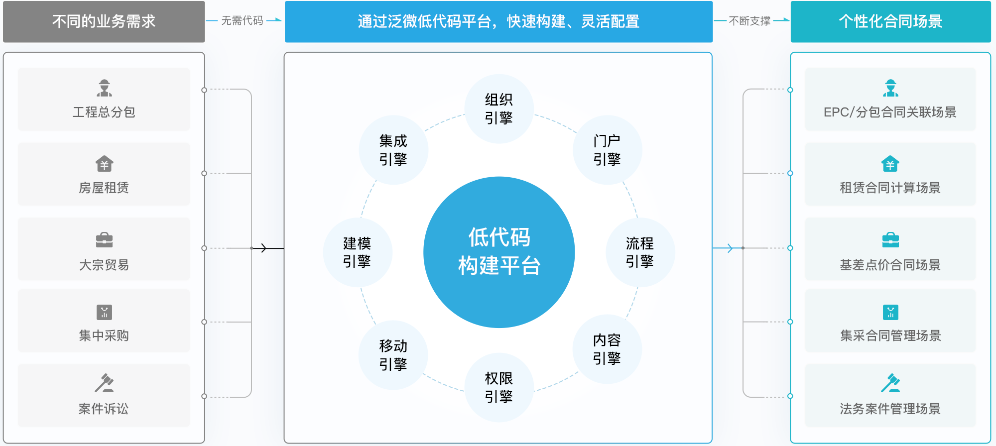完善集成引擎,便捷集成与被集成,让合同模板、智能审批、风险监控能力能够开放出来,融入业务过程;合同数据也能够随时被业务、财务、项目等系统调用