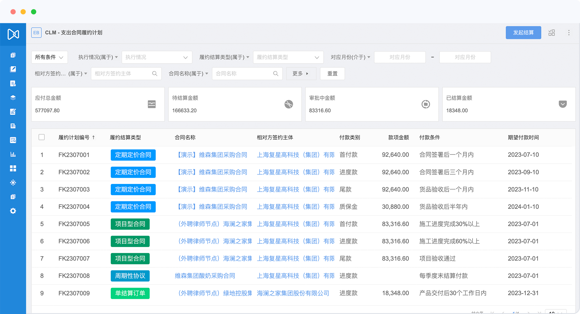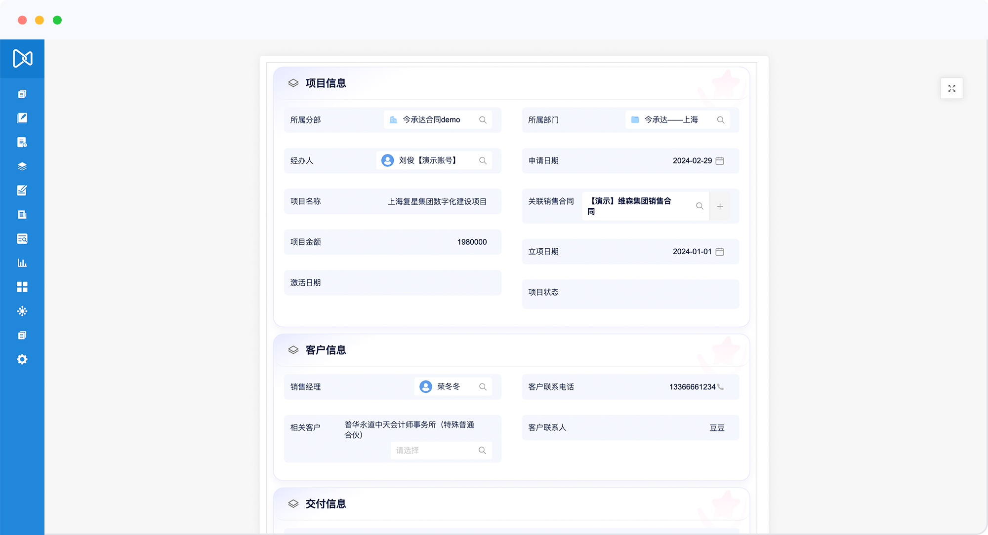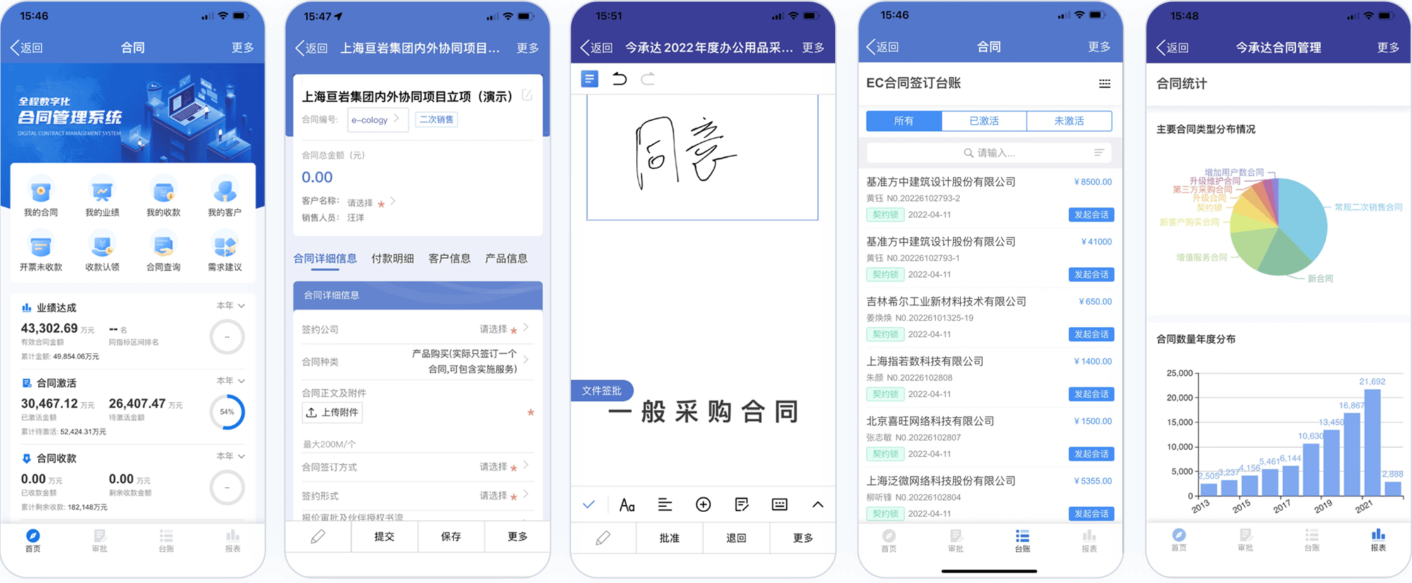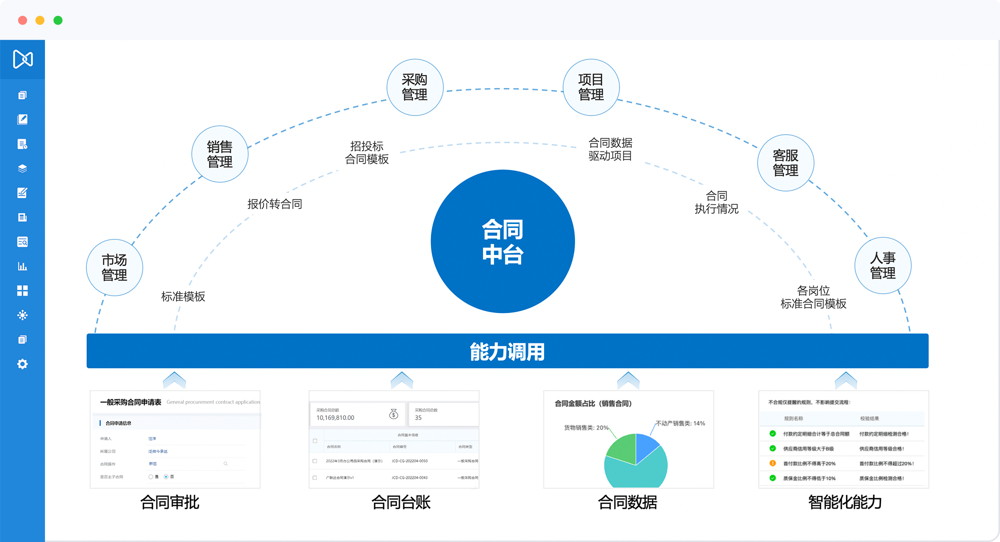 合同数据驱动收付款动作、项目立项、销售结算等等,合同与业务融合在一起。