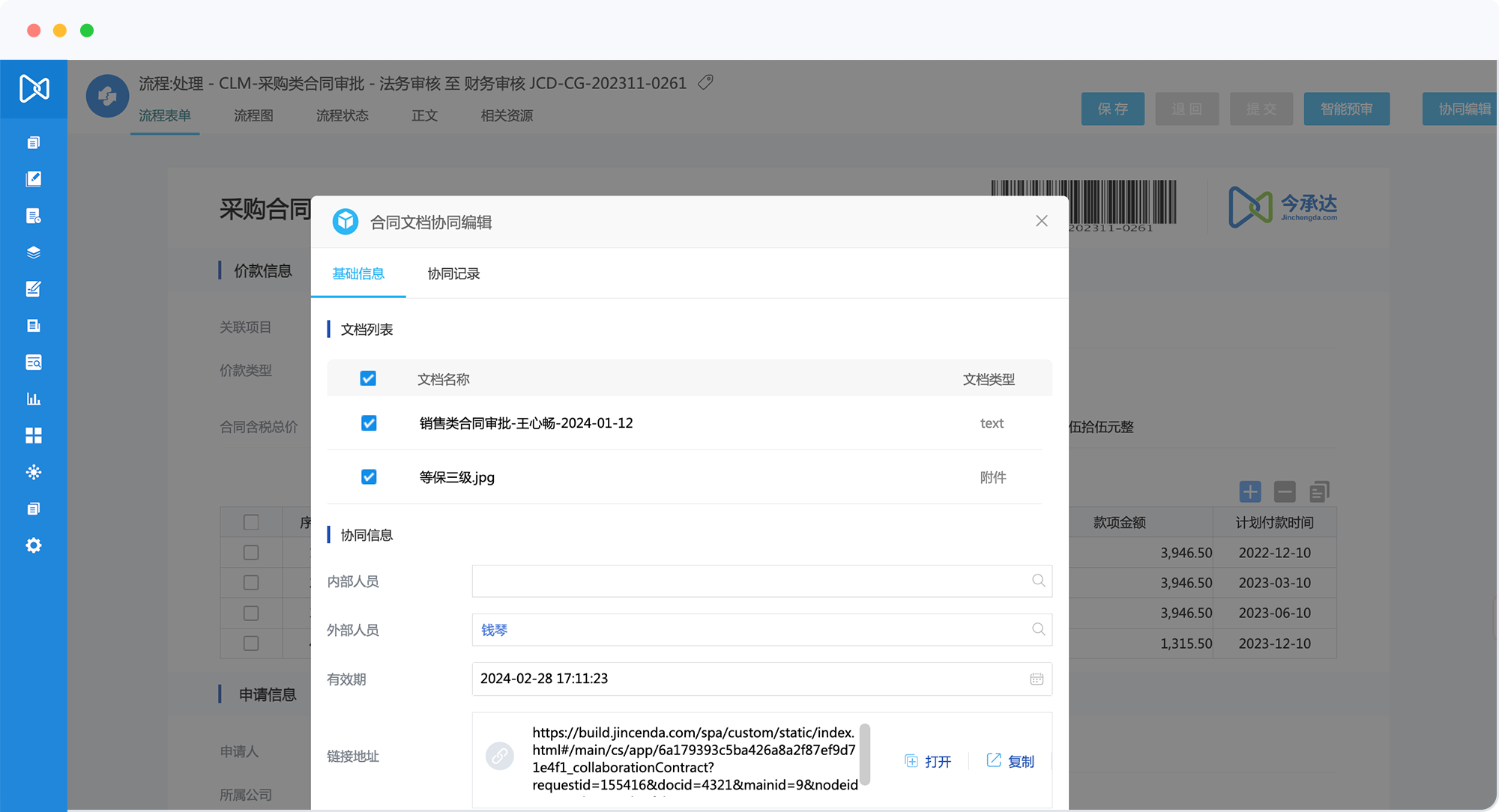 拉通内外部人员,构建群交流,协同合同文本编辑。