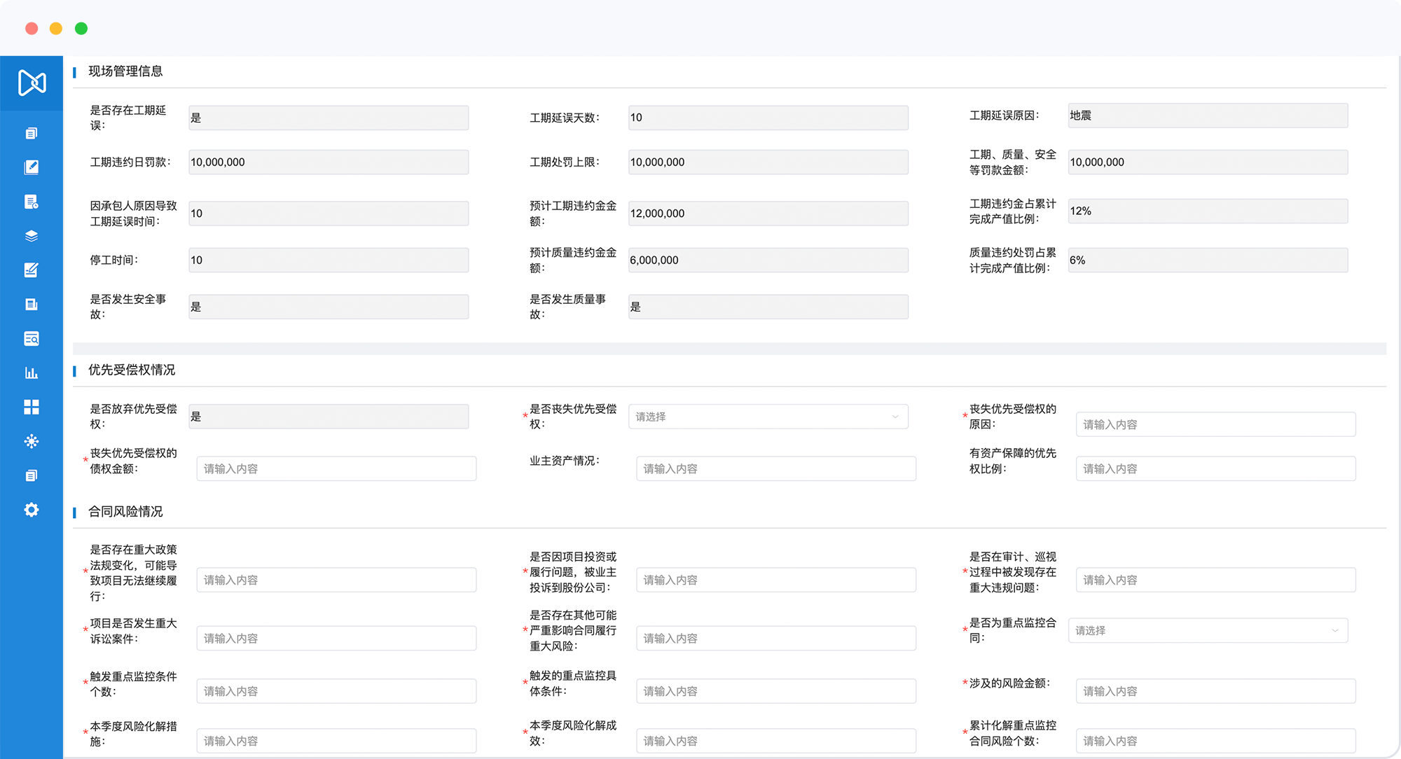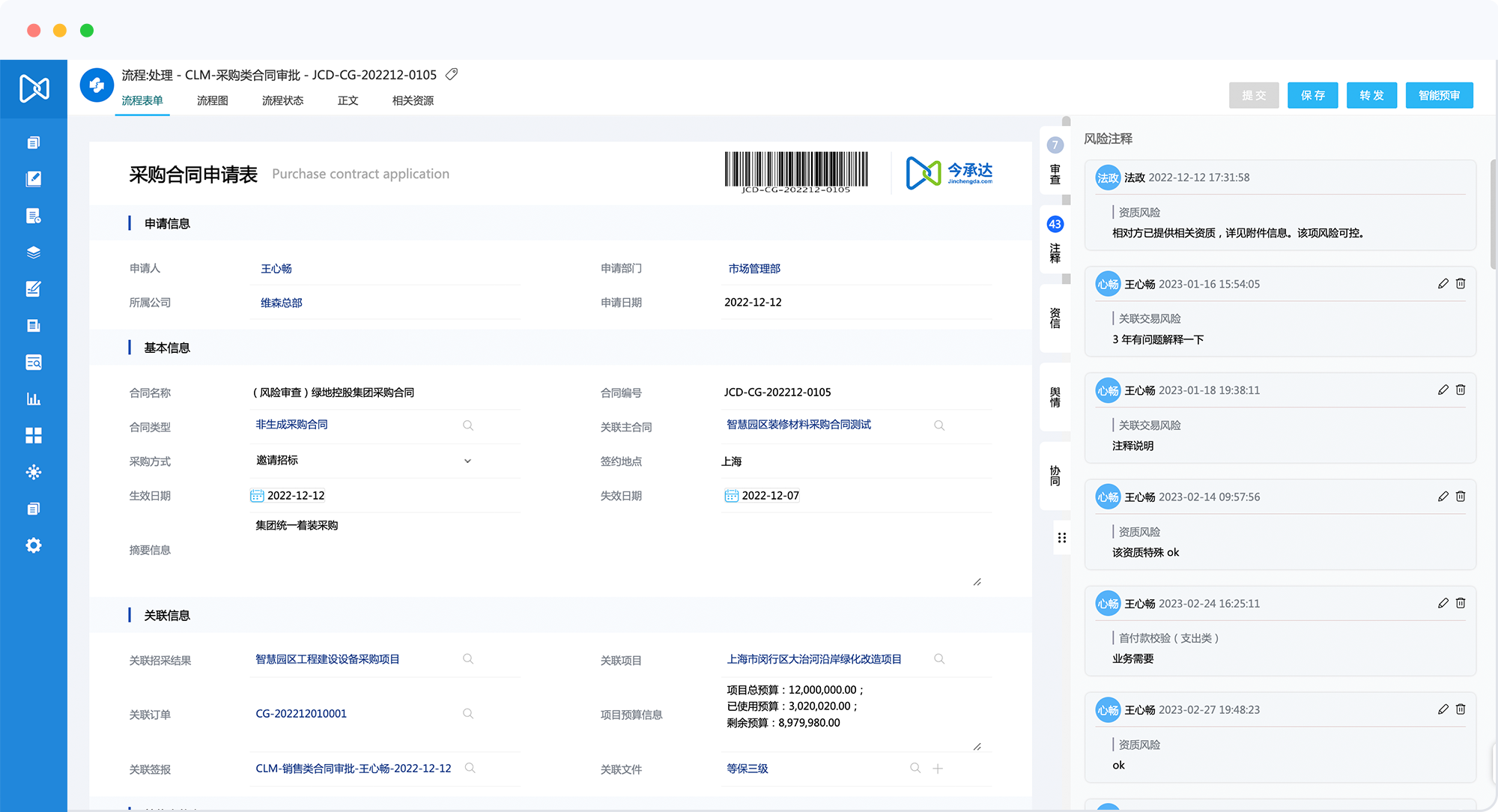 通过埋点,实现合同签订前资信、条款;签订中业财法规则;履约过程中延期等风险预警,一旦触发自动预警提醒。