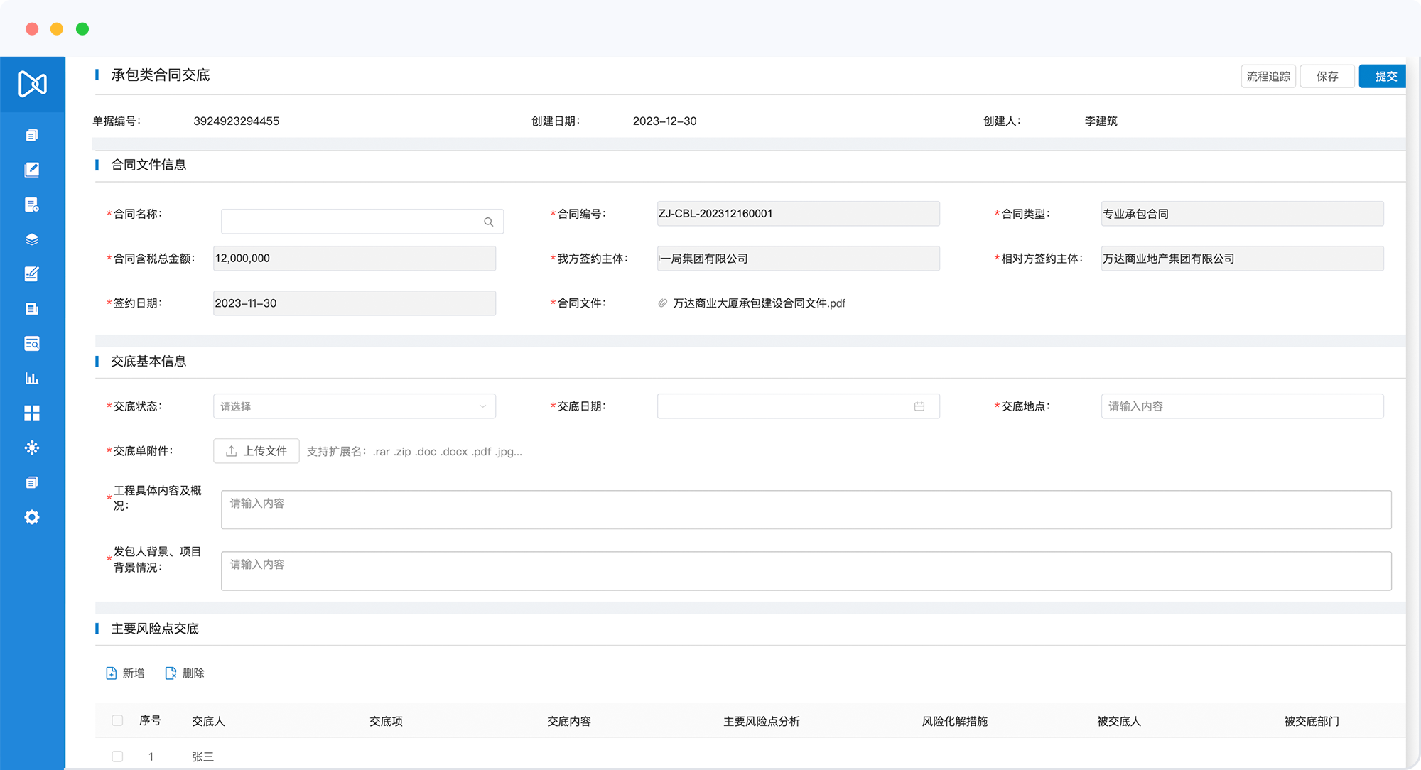 通过合同一次交底、二次交底,能够将合同实际情况、风险信息准确推送给业务端。