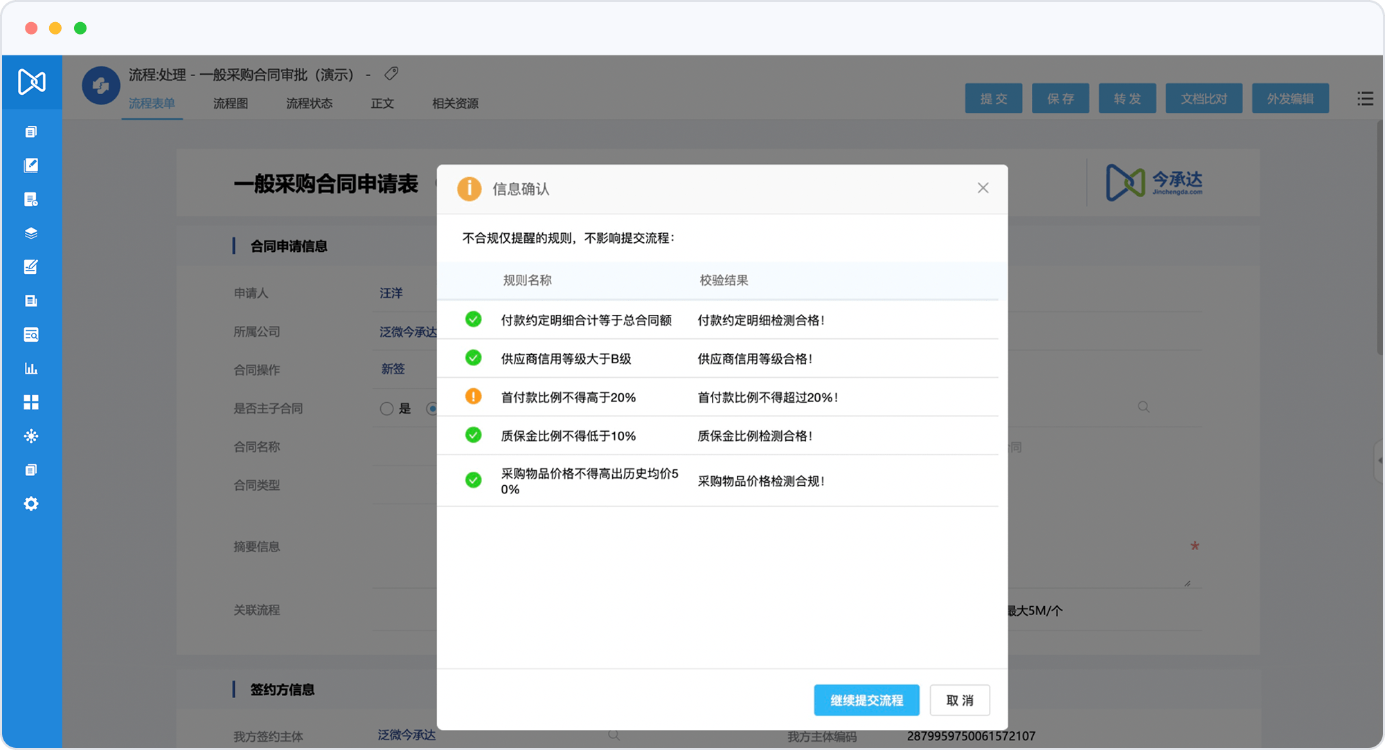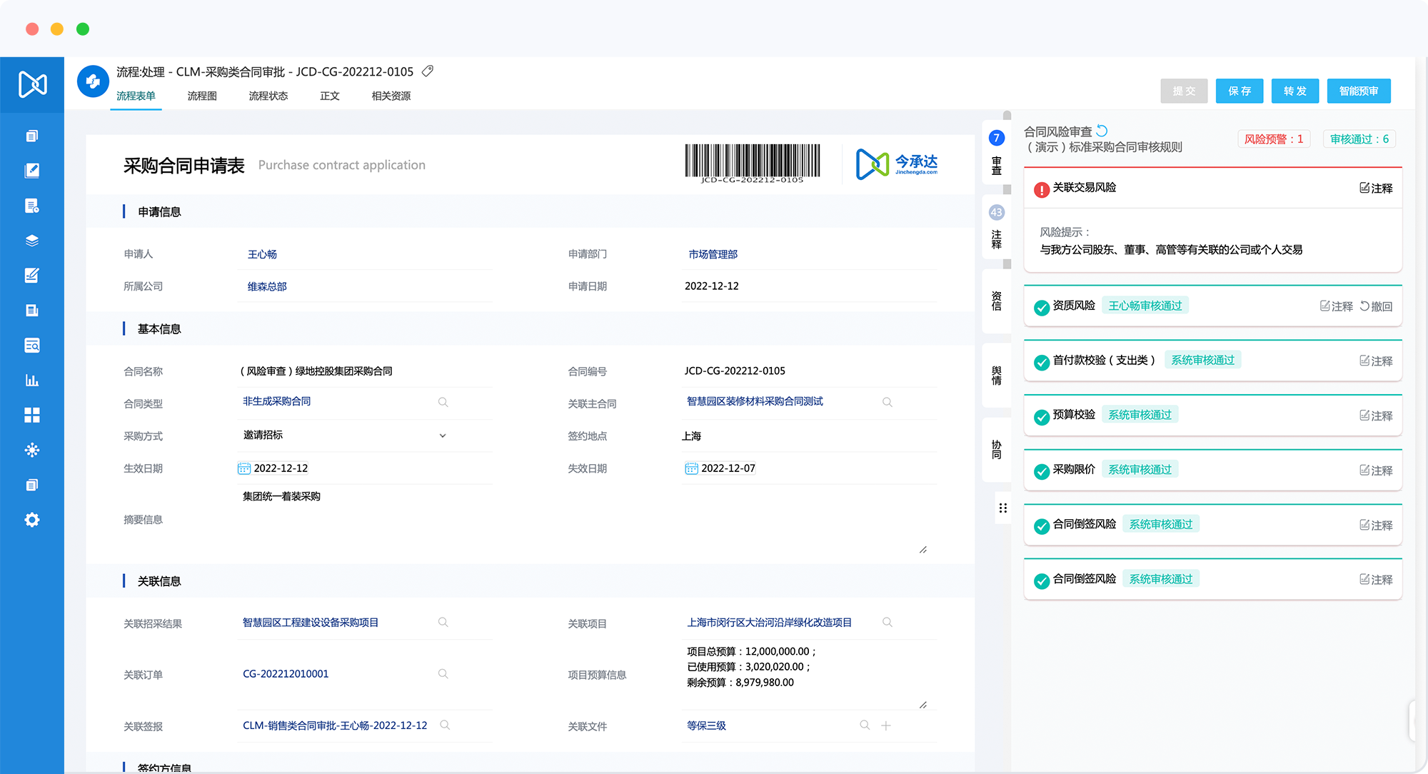 能够将管理、业务、财务相关规则融入规则库,在合同审批过程中进行自动研判,例如合同首付款校验、历史合同均价校验、合同倒签校验等。