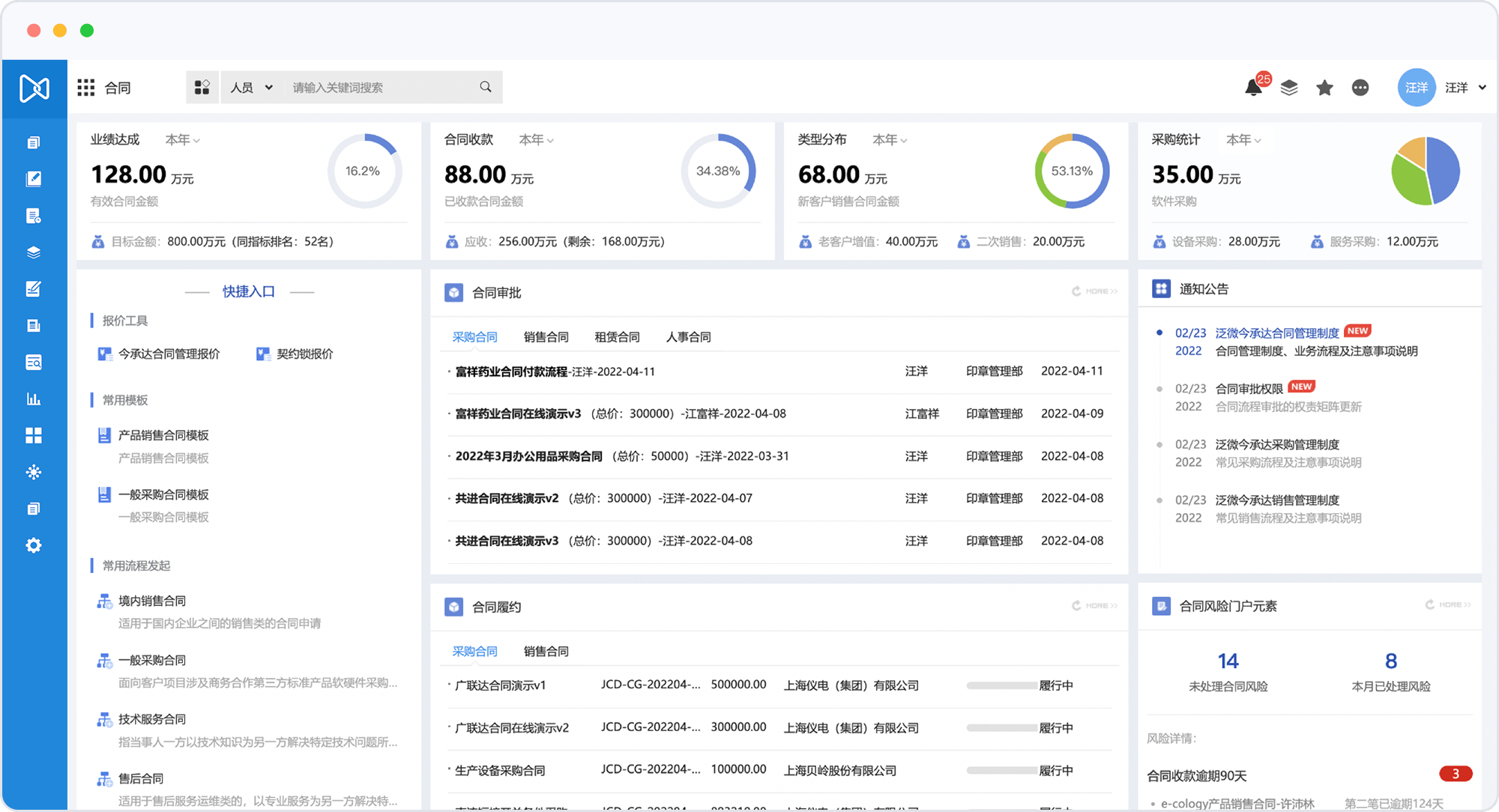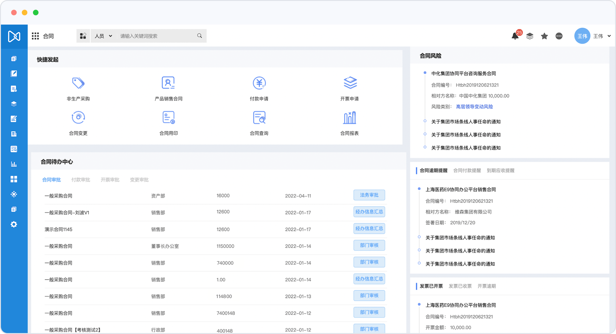 核心关注如何便捷地发起合同,能够跟踪发起合同的审批情况,合同执行过程中有新的信息能够及时获取。