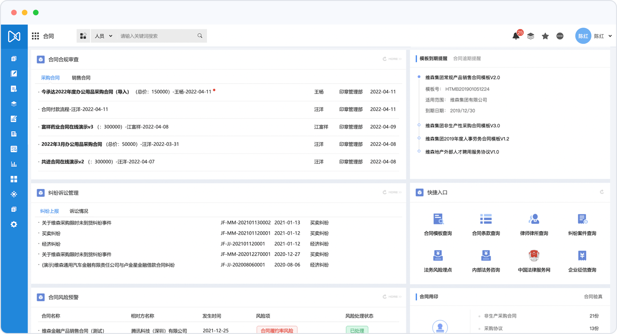 核心关注合同文本快速审核、合同规则合规检查,合同风险主动预警,合同模板库、条款库是否需要更新。