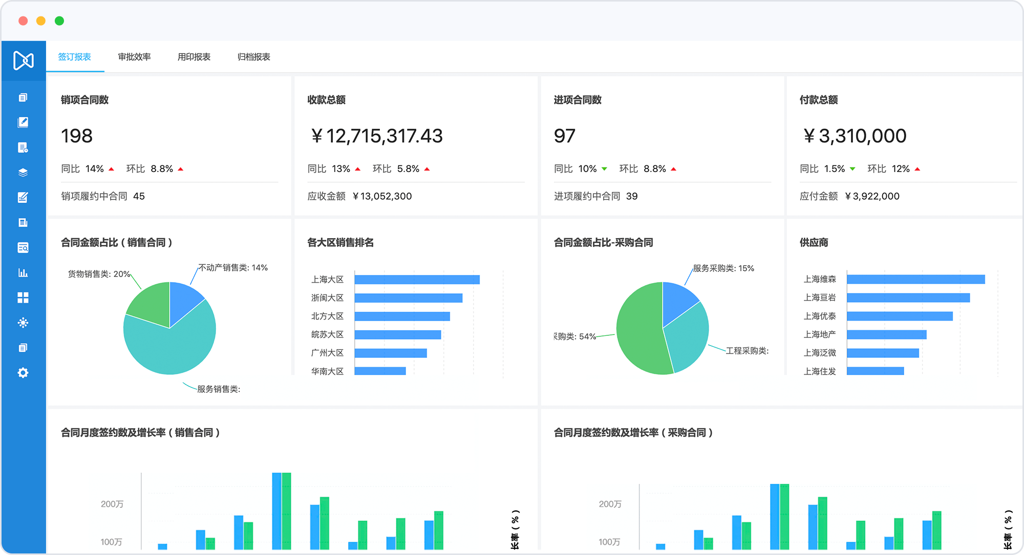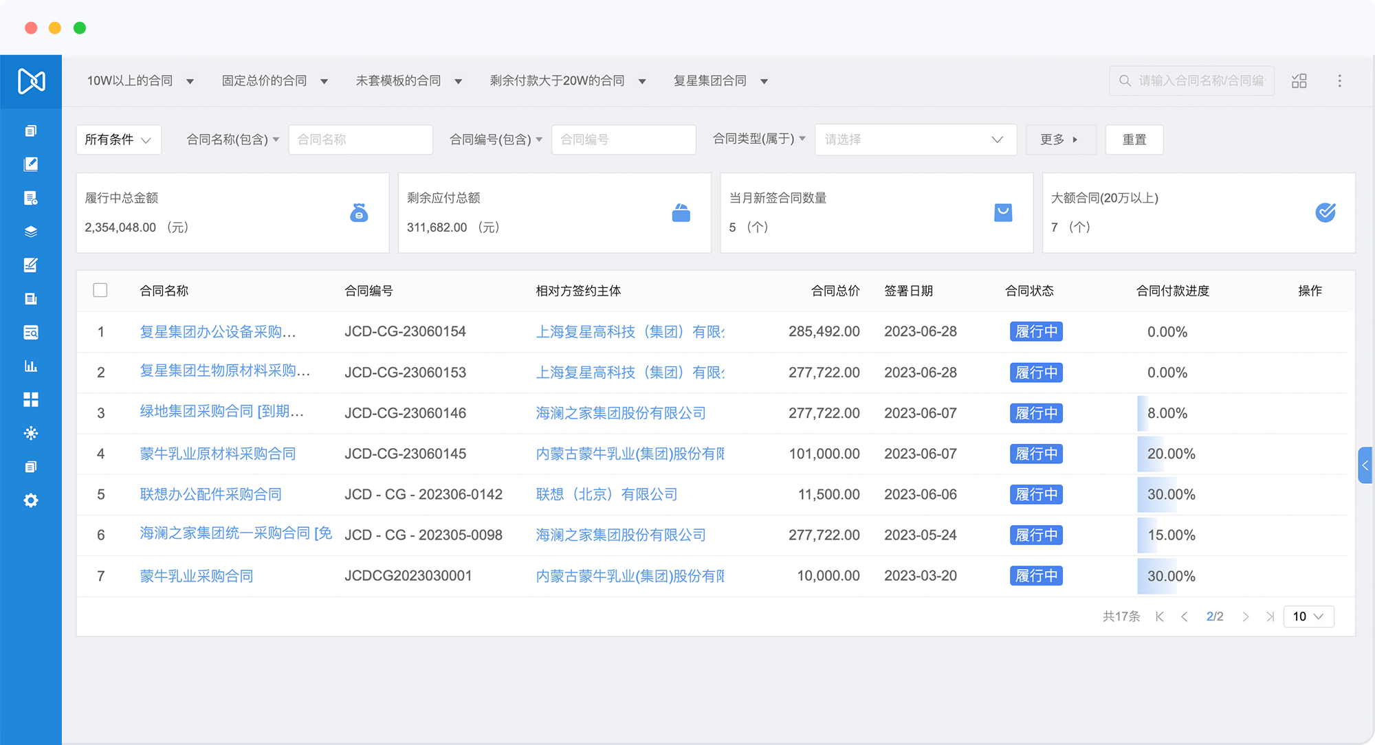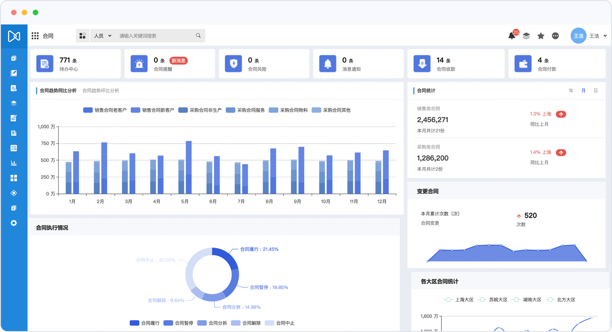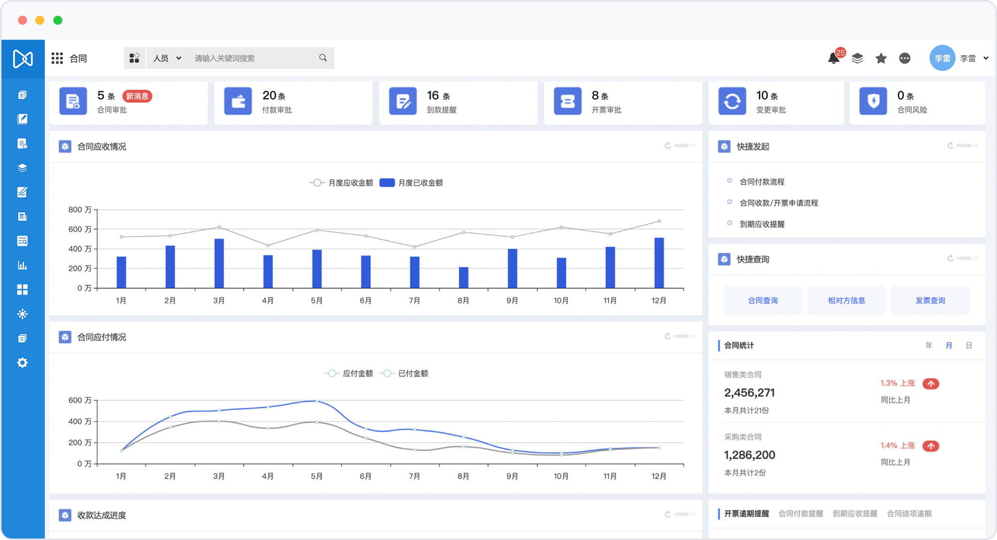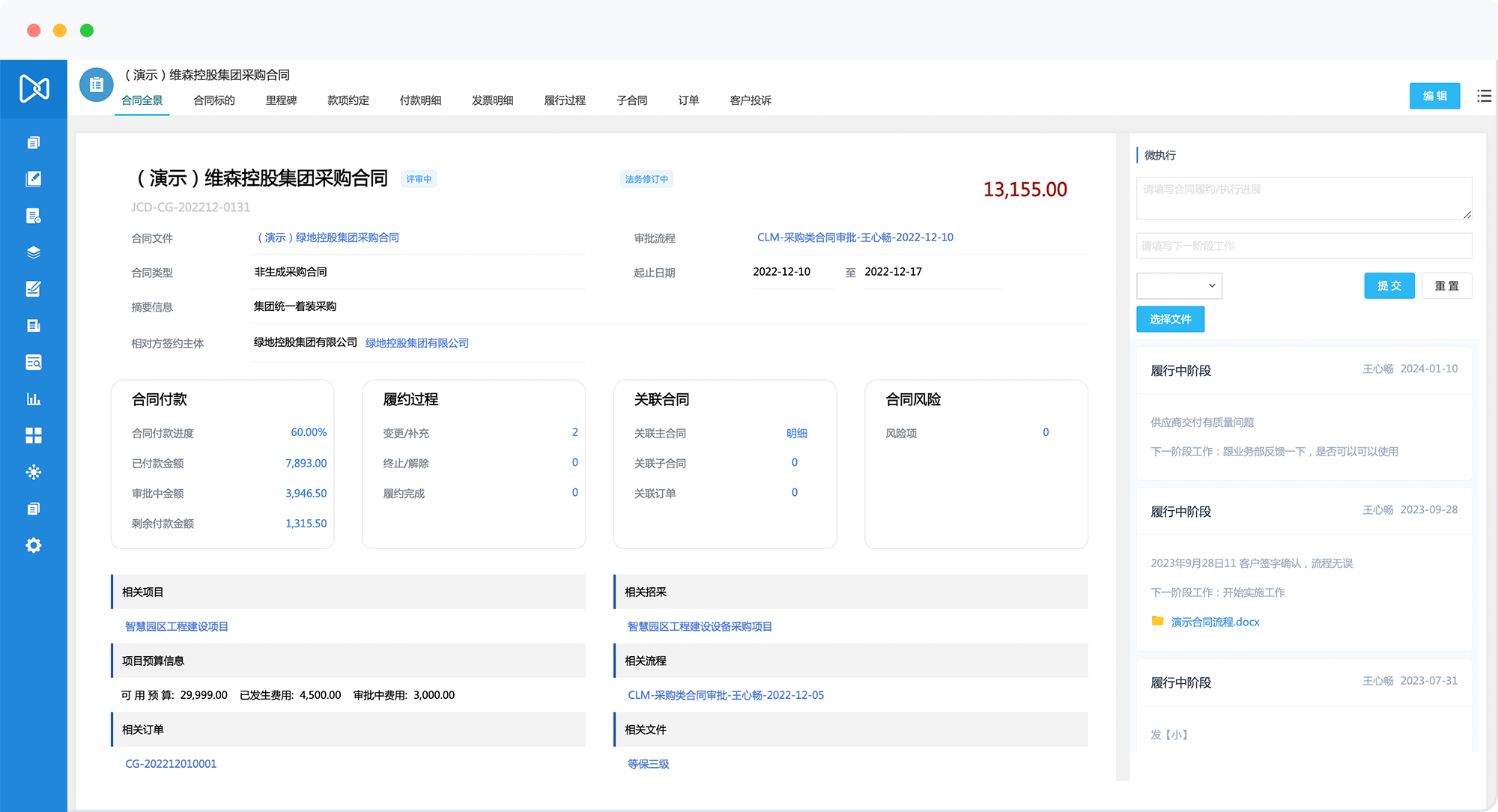标准化合同收付与变更,履约所有信息自动汇总,监控执行状态。