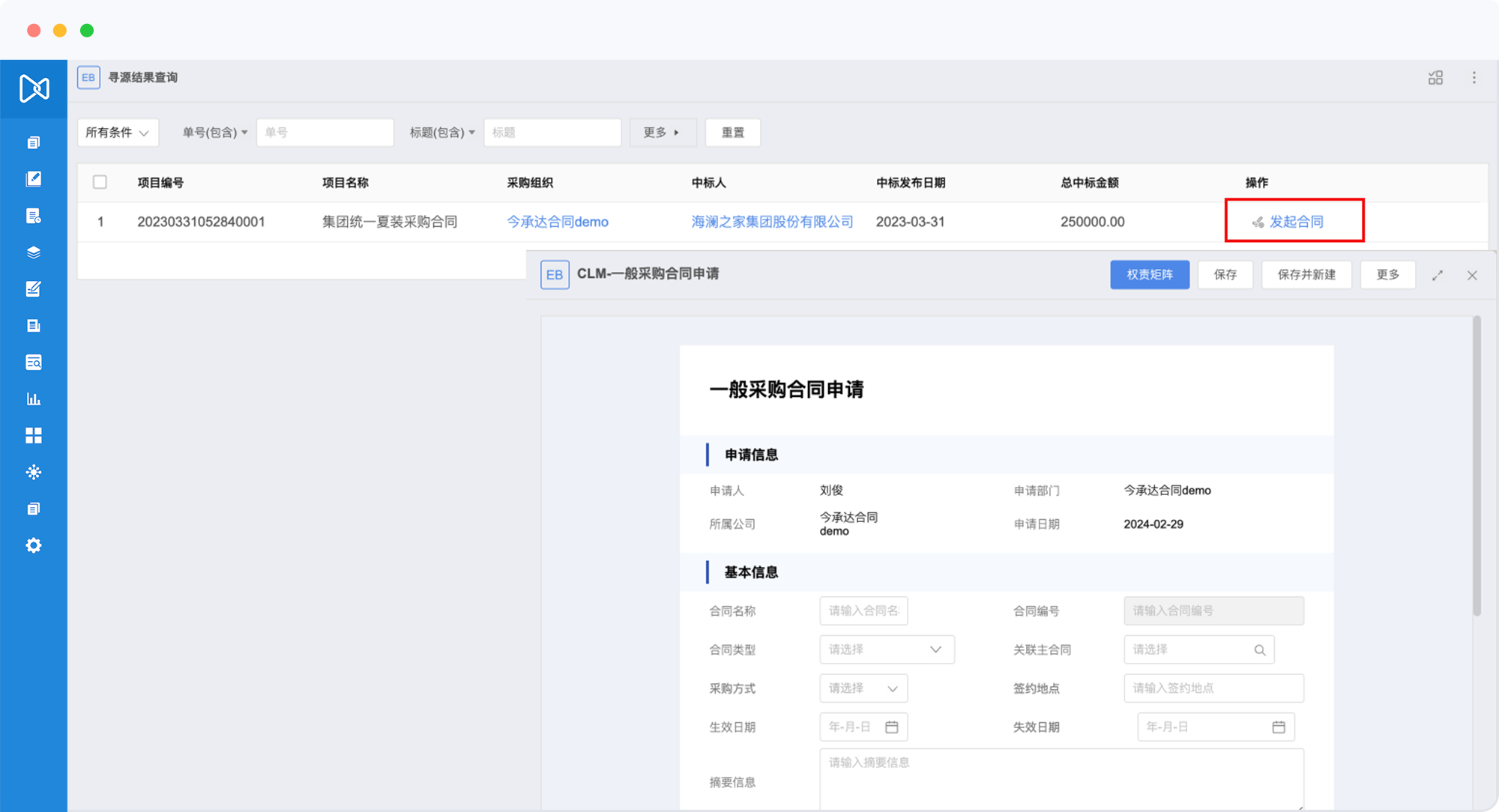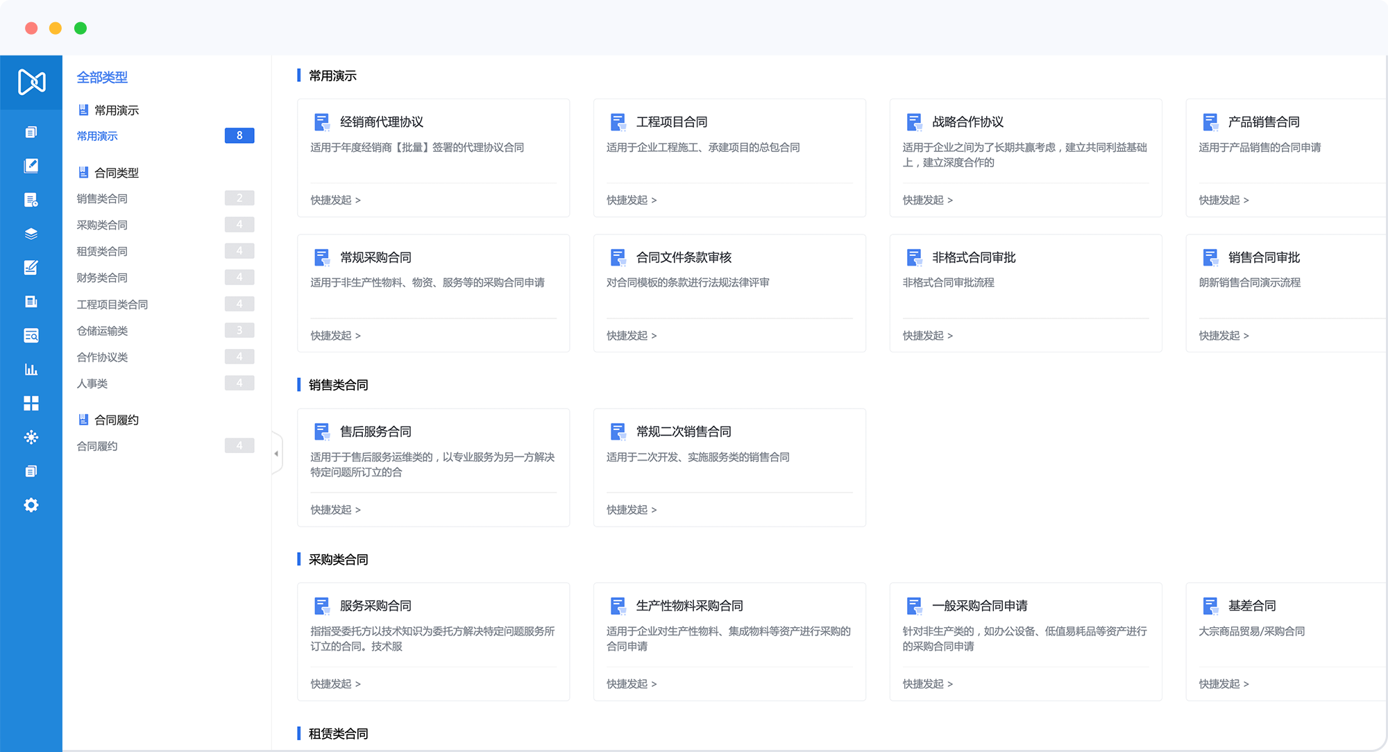 一个合同平台,能够支持全组织采购、销售、合作协议、工程、投资等各类合同的统一发起。