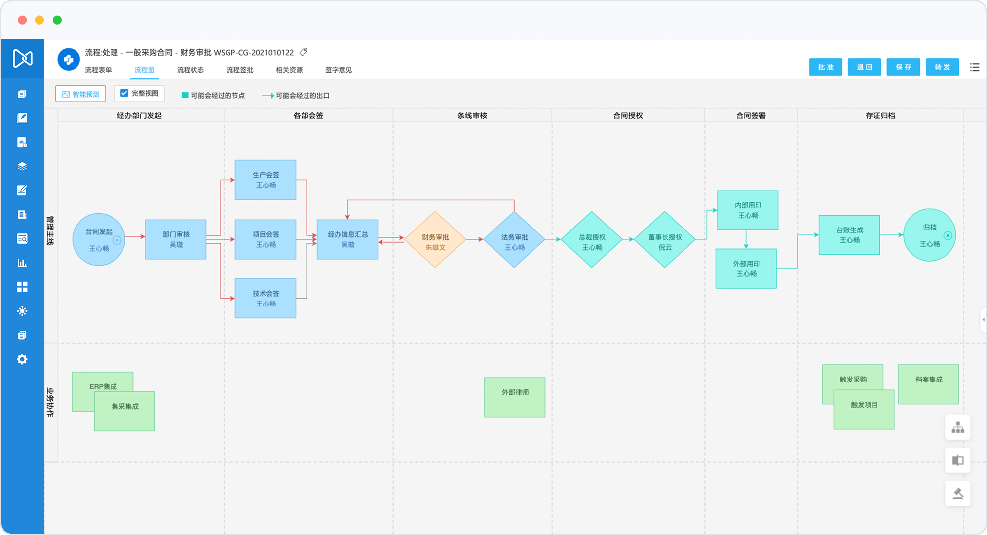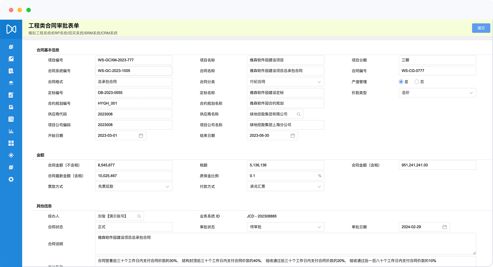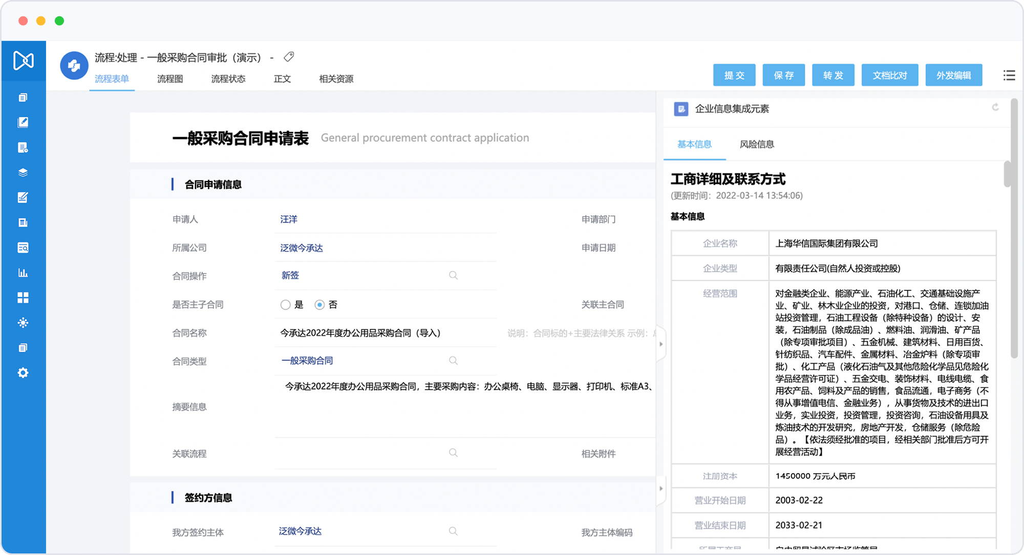 可以对接营销、采购系统,从业务系统发起,业务数据直接对接,生成合同审批流程。