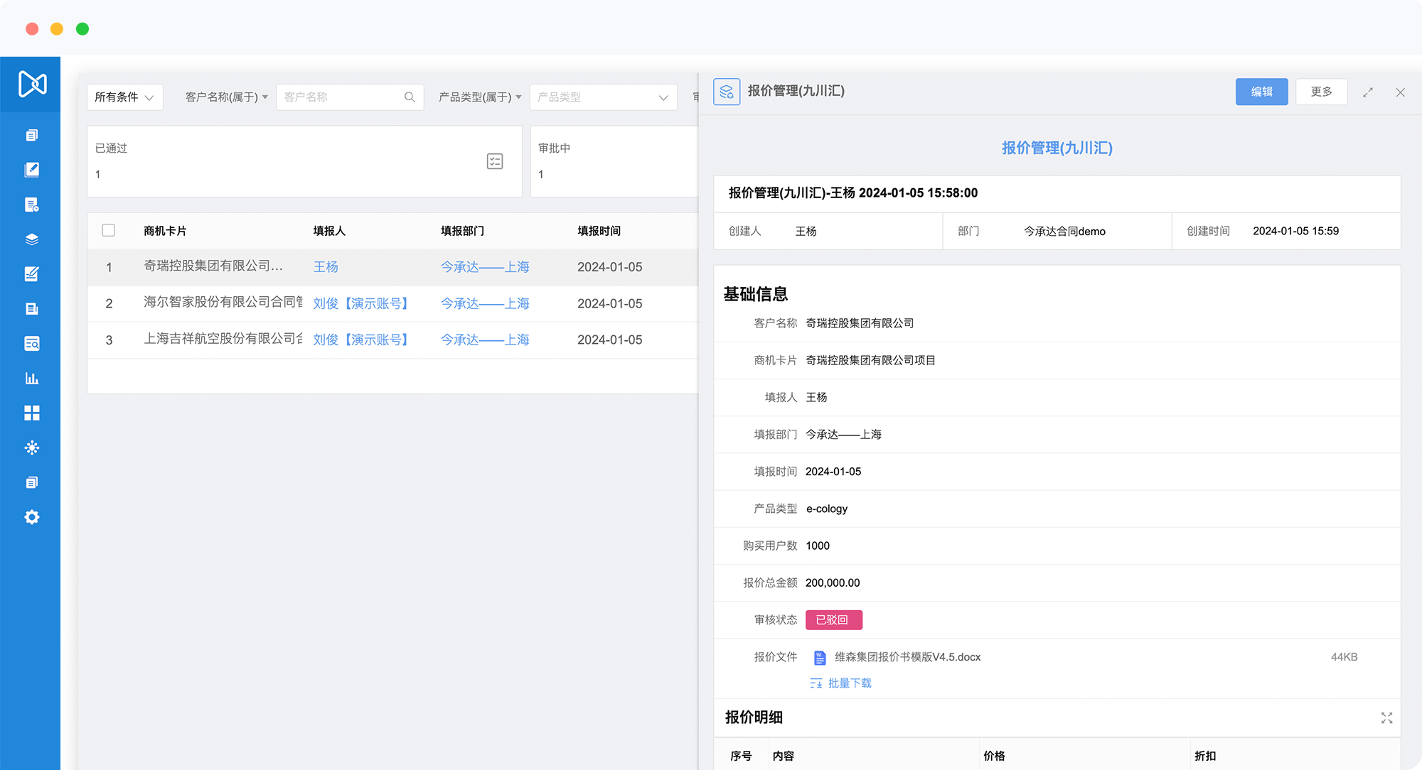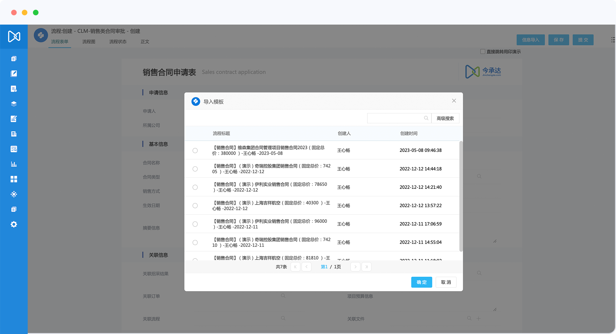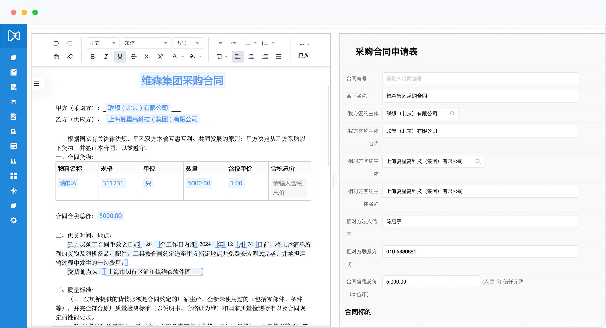 销售系统、采购系统可直接调用合同模板,报价信息转化为合同关键字段。