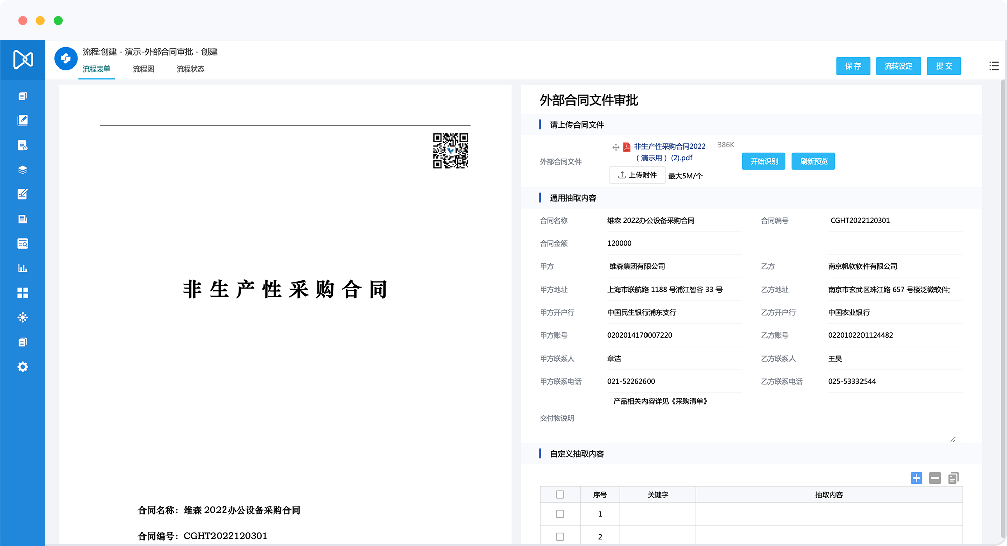 外部发来的合同文件,无论是word、pdf和图片,都能够进行智能识别,抓取合同关键要素自动完成表单填写,实现从文本到表单要素的自动转换,提高起草效率。