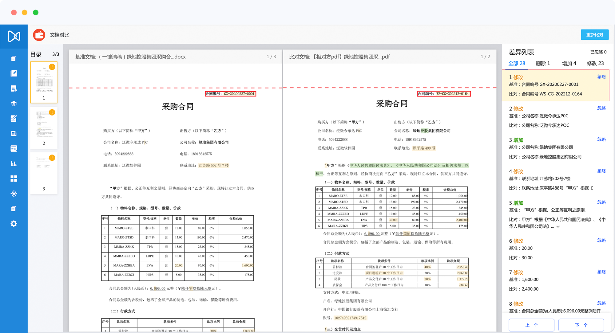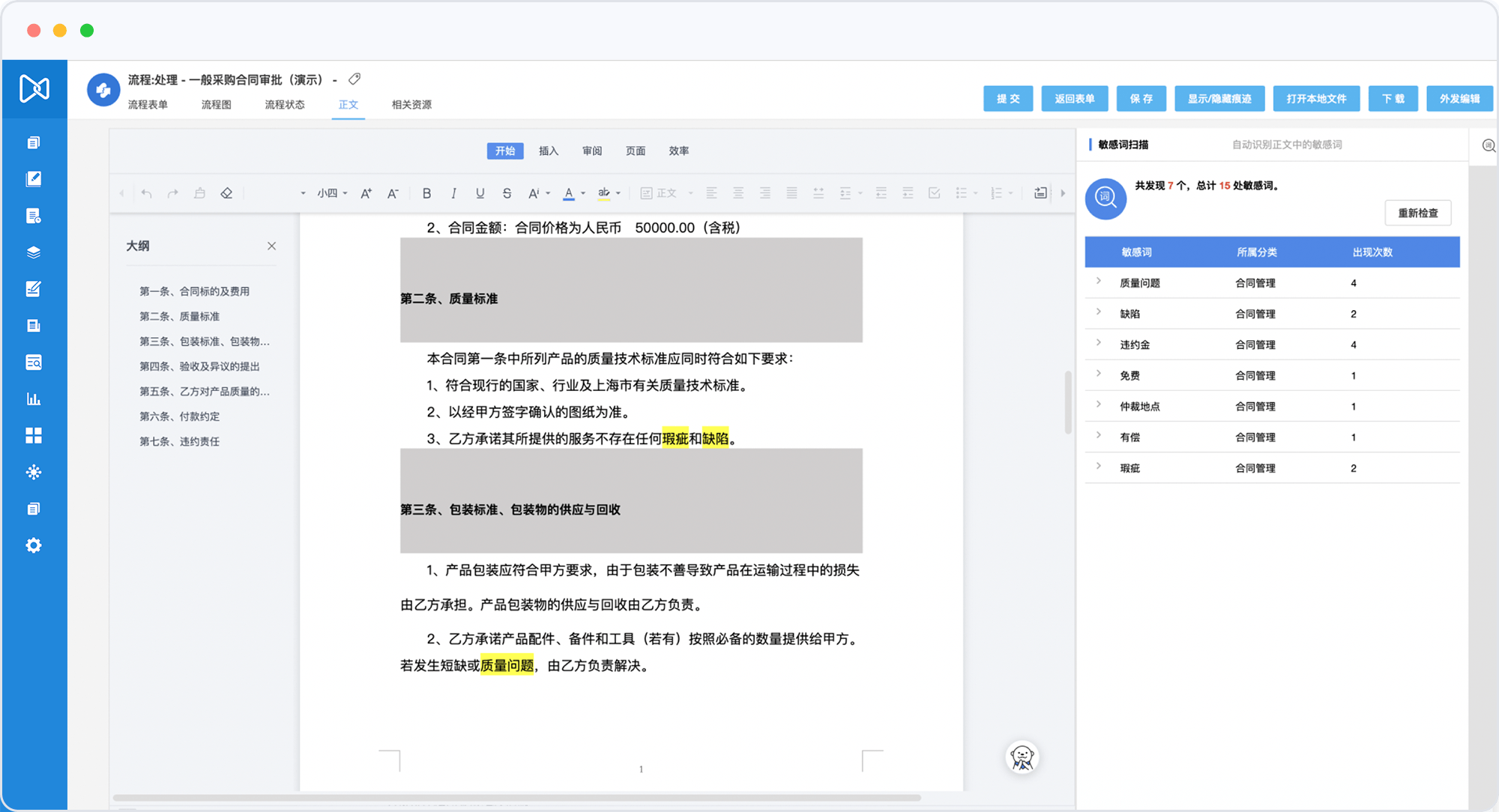 根据不同类型合同,预设关键词,一旦合同文本中出现关键词信息,自动高亮凸显,帮助定位确认。