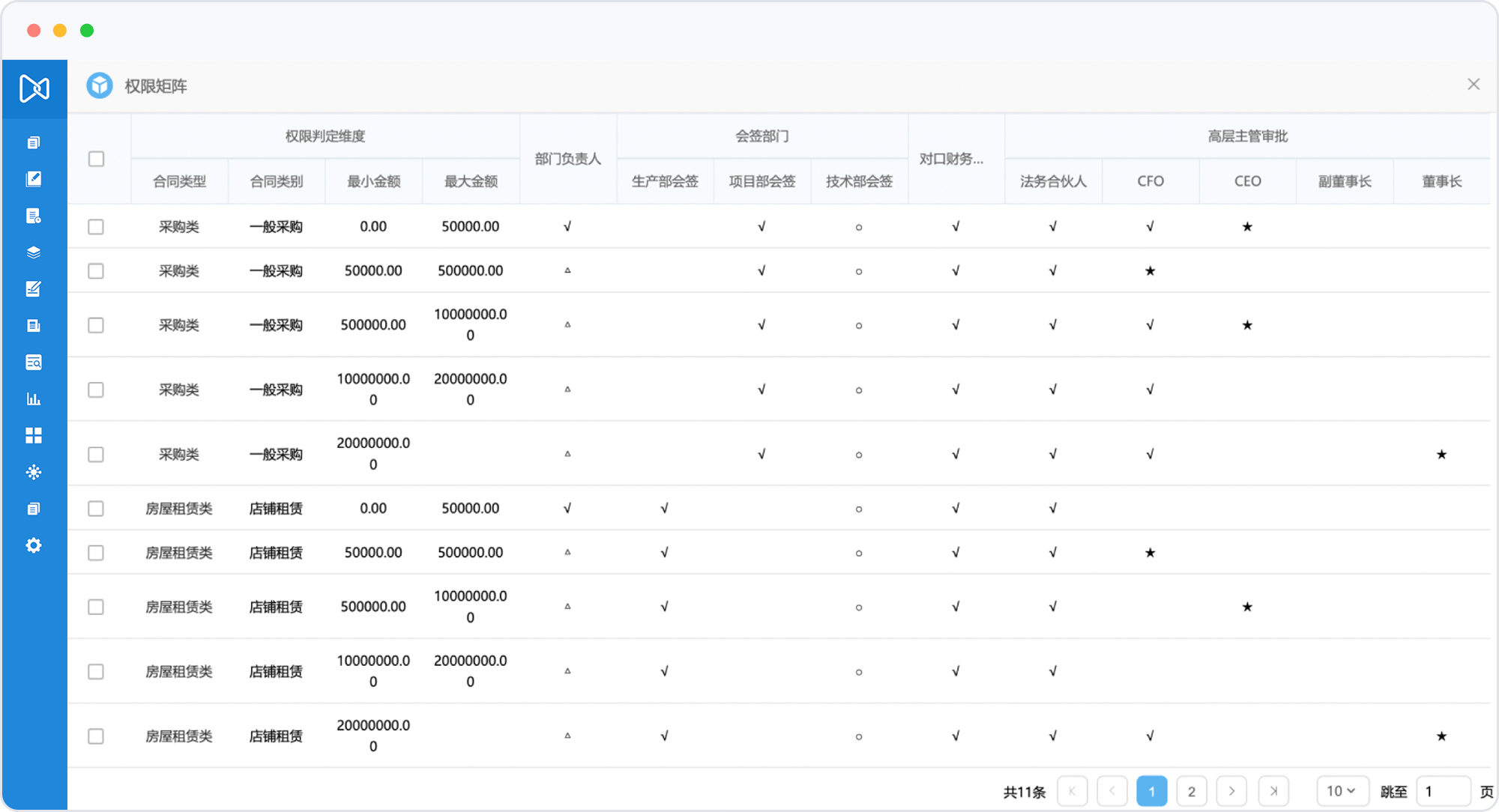 企业按照组织、类型、区域、金额等要素形成的审批权责矩阵,能够导入自动生成合同审批流程,各部门明确权责,实现审核规则落地。
