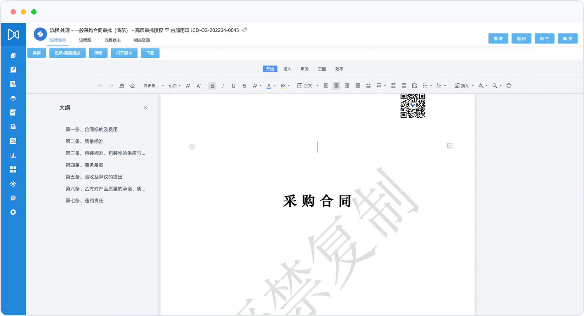 流程审批完毕后,形成待用印合同文件,可在指定位置,插入自定义水印或者二维码。