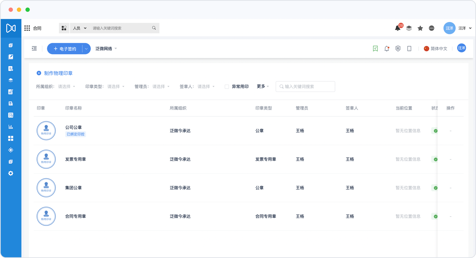 无论电子印章或物理印章,为每一枚印章建立档案,印章全生命周期管理,根据不同合同类型调用不同印章,支持分级分权管理,构建组织统一印控平台。