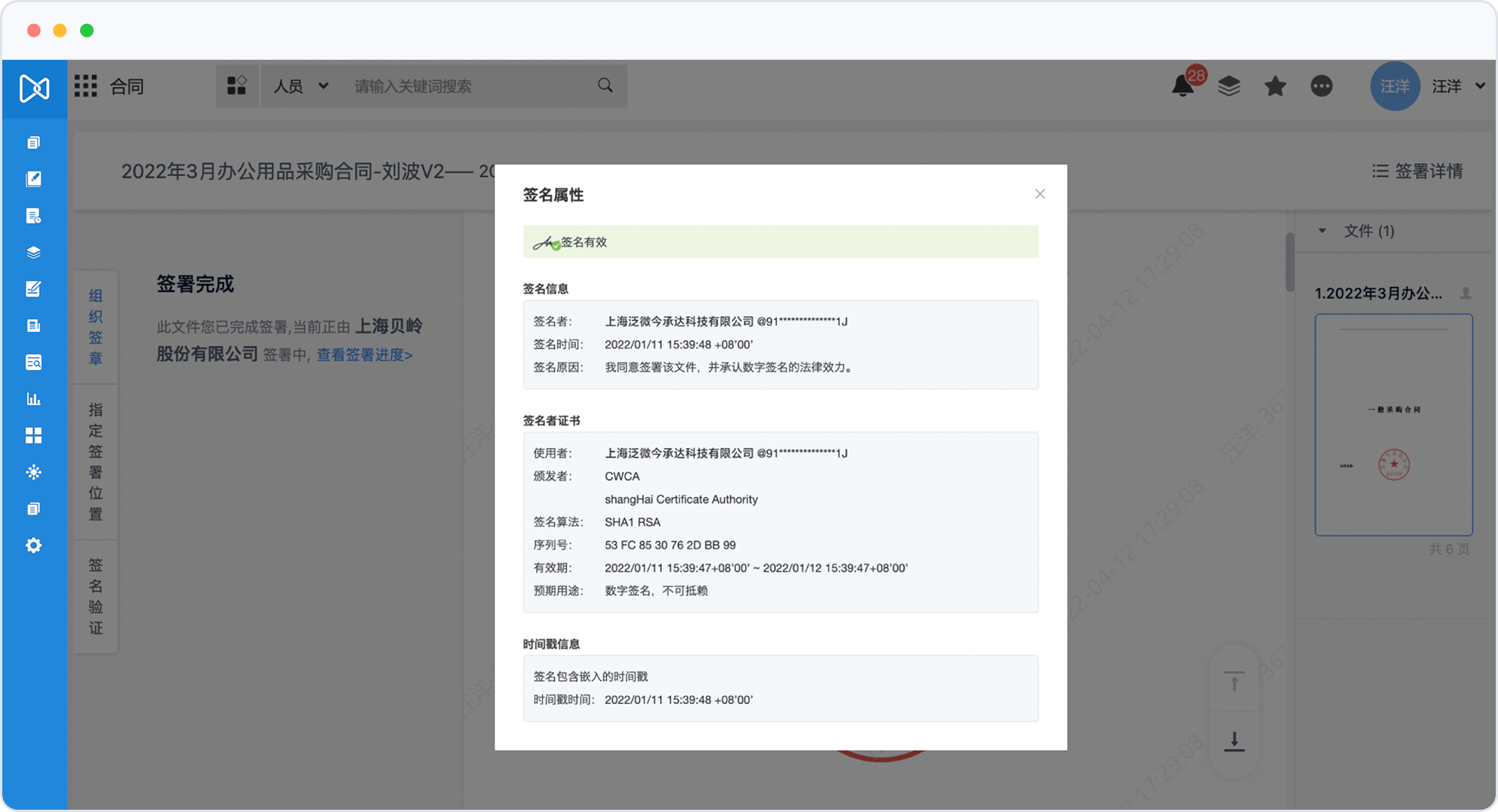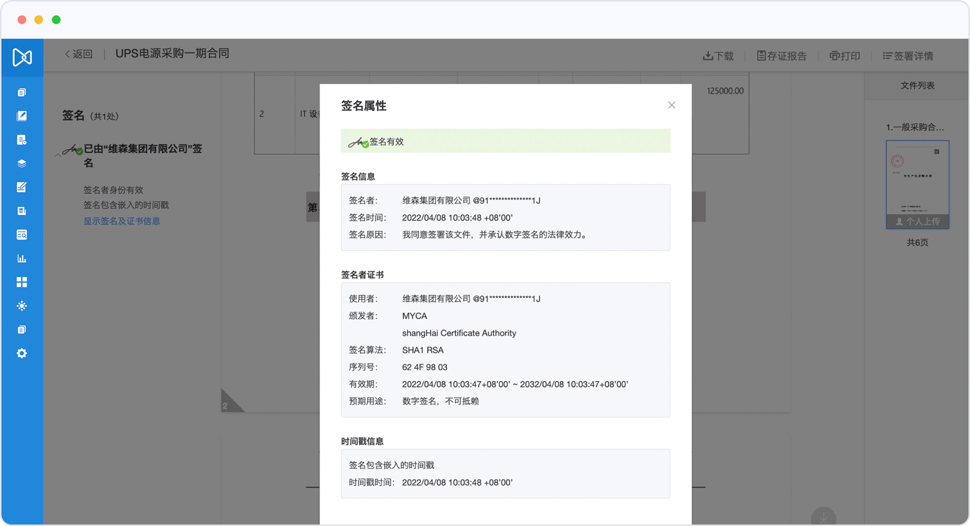通过个人实名认证,保障合同档案管理各环节的人员身份可信;通过数字签名,保障合同档案内容不被篡改,具有法律效力。