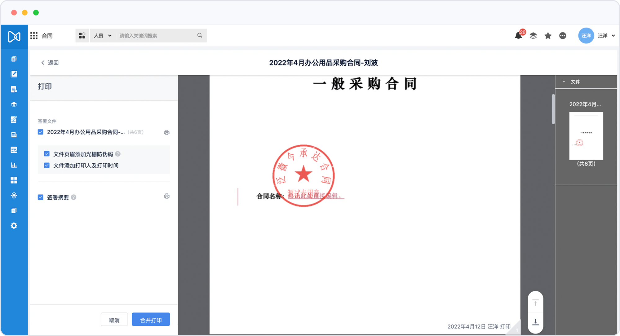 电子合同纸质输出时,可以通过添加动态防伪码进行防伪打印输出,确保纸质文件不会被抽换页码,保证了纸质合同的安全可靠。
