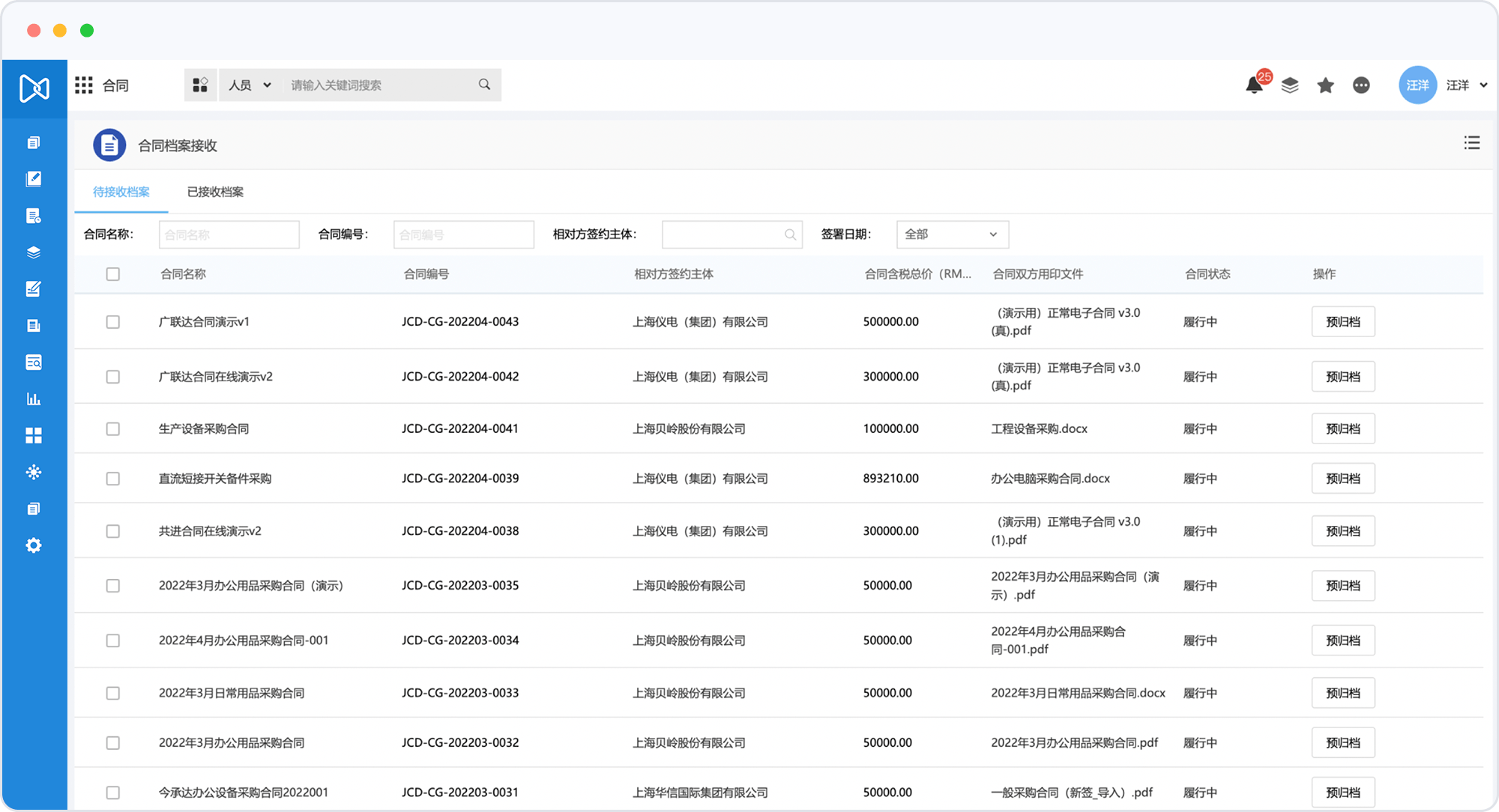 所有的合同文档、包括正文、附件、签批件、订单、发票、收付信息,都可以自动数智化归档,合同档案全生命周期数智化管理。