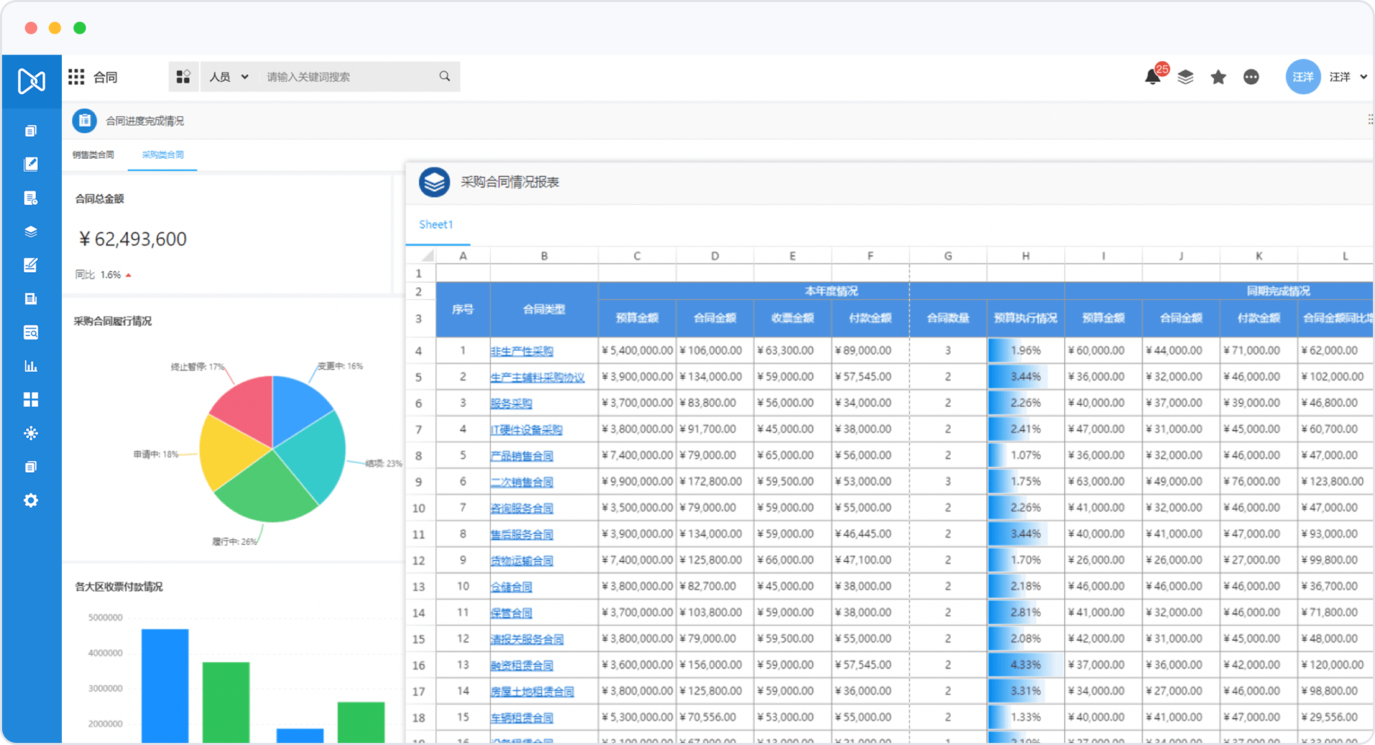 对于合同管理相关数据以及对接业务、财务异构系统数据,进行汇总及交叉分析,生成相关的报表,并进行可视化展现。