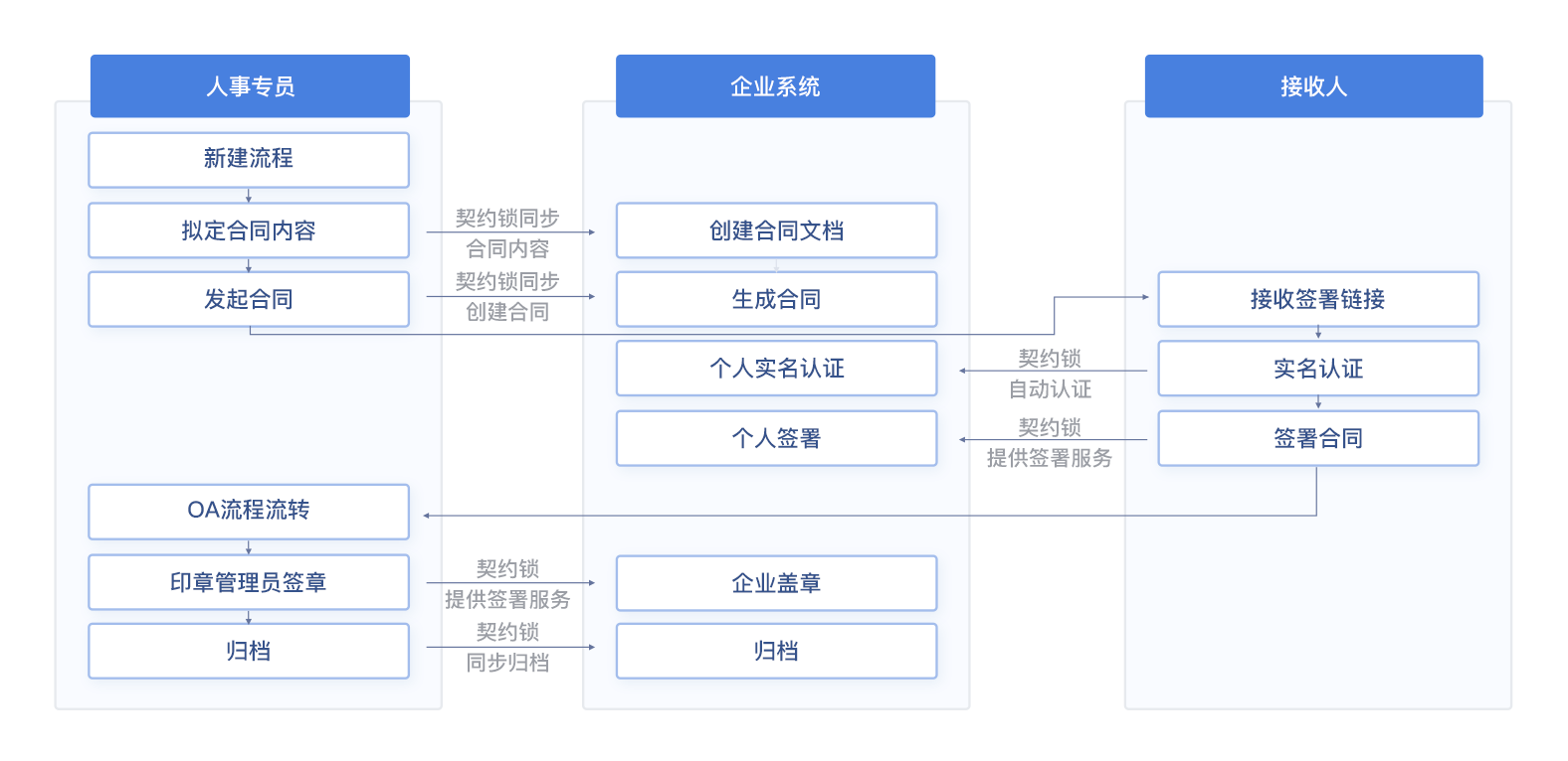 - 通过身份认证核验和电子签,可以快速完成人事合同的签署,无需线下打印、快递、人工追踪,异地人事合同签署变得容易;
