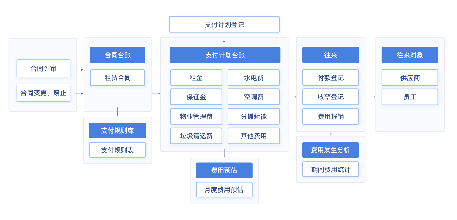 - 能够按照合同租赁规则,自动计算固定租金、营业提成、物业费用以及其他费用,能够明确记录代付代缴,按照年、季、月等周期明确资金准备;