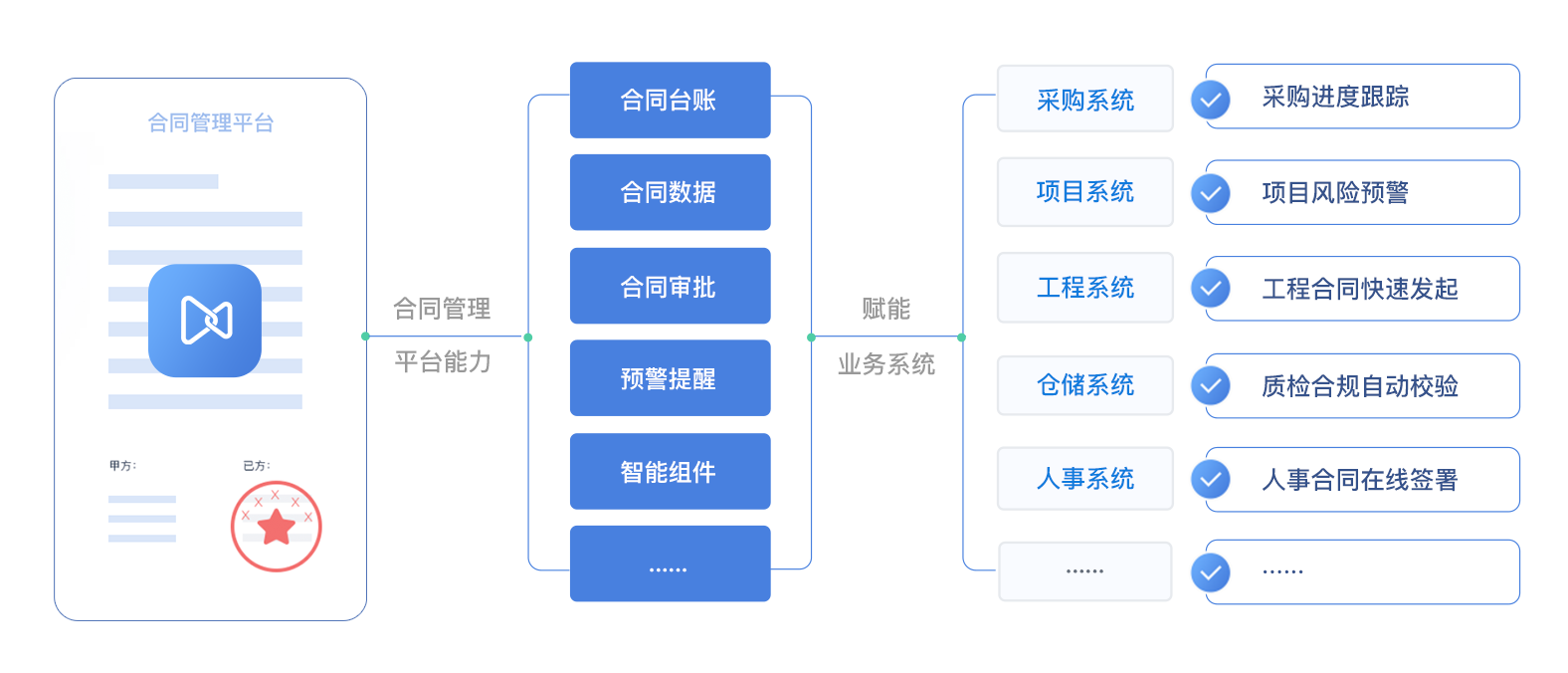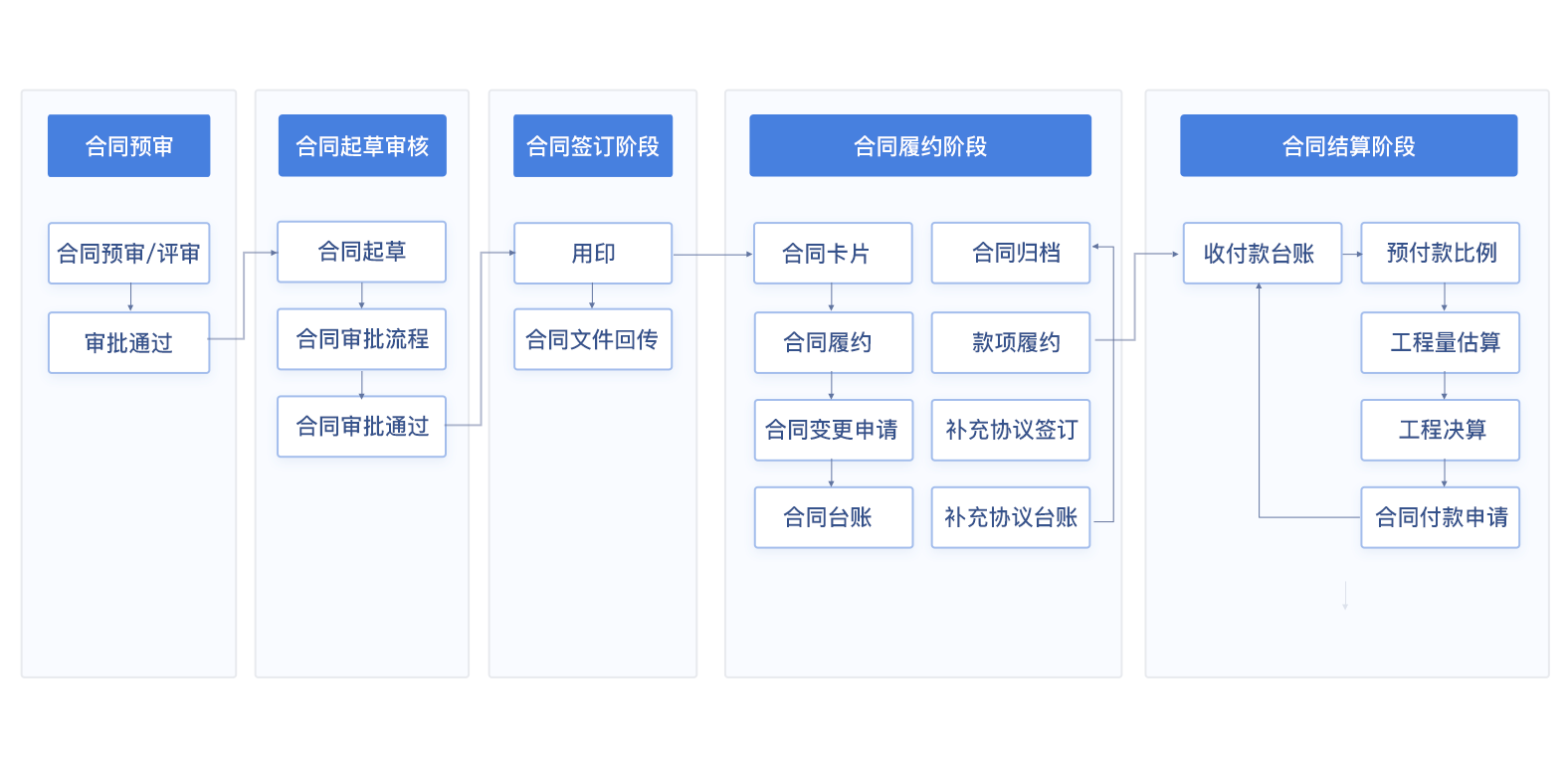 - 提供工程合同场景中从EPC/PC合同到专业分包、劳务分包、物料分包合同等完整合同业务场景的支撑。